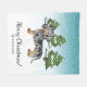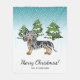 Desteis originelle Cartoon-Illustration eines niedlichen kurzen Haar schwarz und tan Daple Fell Farbe Dackel züchten Hund. Der Hund ist in einer Winterlandschaft mit drei grünen Tannenbäumen und fallendem Schnee untergebracht. Der Hintergrund ist ein blaues bis weißes Gefälle, das das Design des kalten Wintertages verleiht. Es gibt auch einen personalisierbaren Textbereich, der jetzt "Frohe Weihnachten!" in einem schönen Script-Schriftart liest. Darunter befindet sich ein weiterer personalisierbarer Textbereich für einen Familiennamen oder einen anderen benutzerdefinierten Text.