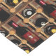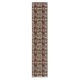 Dieser moderne Tischläufer zeichnet sich durch ein sich wiederholendes abstraktes Muster aus aufrecht roten und schwarzen Flaschen Bordeaux-Wein aus, neben weiteren Flaschen in einem braunen, goldenen und gelben Holzständer. Ein rustikal orangefarbener Backsteinboden rundet die Komposition ab.