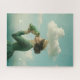 Ein märchenhaft inspiriert Porträt einer Regalfrau in Vintagem Grün, die einen lebendigen Frosch vor einer traumhaften Ozeankulisse küsst. Whimsikal, romantisch und zeitlos elegant.