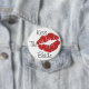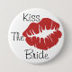 Text liest: "Küssen Sie die Braut". Roter Lippenstiftkuß auf der Mitte dieses Knopfes. Idealer Zusatz, zum auf der Nacht des Mädchens heraus zu tragen. Genießen Sie diesen Junggeselinnen-Abschied in der Art!