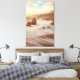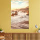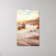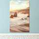 Das Bild erfasst einen atemberaubenden Sonnenuntergang über einer rauen kalifornischen Küste. Der Himmel ist eine weiche Mischung aus Rosa, Orange und Blau, wobei die ätherische Atmosphäre durch weiche Wolken ergänzt wird. Im Vordergrund befindet sich ein Sandstrand, an dem Wellen abstürzen, die eine faszinierende Weiß- und Brauntönigkeit erzeugen. Mehrere große Felsformationen erheben sich vom Wasser und verleihen der Szene ein Gefühl der Großartigkeit.