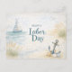 Dieses ruhige Labor-Day-Design beschwört die Ruhe eines ruhigen Küstenaufenthalts herauf und symbolisiert die Erholung nach harter Arbeit. Vor einem sanft texturierten, sonnengewaschenen Hintergrund erscheint die Botschaft „Happy Labor Day“ in zarter blauer Schrift, umgeben von friedlichen Meeresbildern. Ein Segelboot treibt über das ruhige Wasser unter fliegenden Möwen, während Strandgräser, Muscheln, ein Seestern und ein seilumwickelter Anker am Ufer liegen. Die gedämpfte Farbpalette und die luftige Komposition schaffen eine beruhigende, reflektierende Stimmung – perfekt, um den Labor Day als einen Moment wohlverdienter Entspannung am Meer zu feiern.