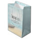 Business danke Ihnen Geschenktasche mit einem schönen rustikalen Bild. Feine Farben von hellblau, sandig braun und sanft weiß. Eine Strandlandschaft mit einem Boot am Ufer mit einem Fischernetz, das an der Seite hängt. Ein eleganter, schäbiger Look.