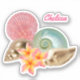 Muscheln, tropische Blume und das Meer. Eine Liebe des Ozeans und alles, was am Strand liegt, zu einem friedlichen und eleganten Küstenbild zu bringen. Personalisieren Sie es auf Ihre Weise.