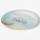 Herzlichen Glückwunsch zum Geburtstag Teller mit einem schönen rustikalen Bild. Feine Farben von hellblau, sandig braun und sanft weiß. Eine Strandlandschaft mit einem Boot am Ufer mit einem Fischernetz, das an der Seite hängt. Ein eleganter, schäbiger Look.