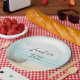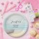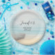 Baby Duschpapier Teller mit einem schönen rustikalen Bild. Feine Farben von hellblau, sandig braun und sanft weiß. Eine Strandlandschaft mit einem Boot am Ufer mit einem Fischernetz, das an der Seite hängt. Ein eleganter, schäbiger Look.