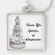 Grosser quadratischer Premium-Metal-Schlüsselanhänger mit einem Bild einer Porzellanstatue von Kwan Yin, der buddhistischen Göttin des Mitgefühls und einer Beschreibung von ihr auf Weiß. Siehe dazu passender Acryl-Fotoskulptur-Schlüsselanhänger, viereckige Mylar-überdachte Taste und Acryl-Fotoskulptur-Button. Siehe die gesamte Goddess-Schlüsselanhänger-Sammlung in den SONDERTOUCHS | Abschnitt Gastgeschenke.