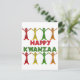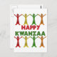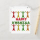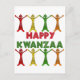 Vier Tänzer in Rot, Blau, Grün und Gelb tanzen zwischen den Worten "Happy Kwanzaa", um das Gefühl von Gemeinschaft, Familie und neuen Anfängen des kommenden Jahres zu feiern.