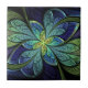 Keramikfliese mit "La Chanteuse IV," ein abstraktes Apophysis-Fraktal durch Susan Wallace. Blätter des befleckten Glases des Imitats des Grüns und des Türkises gestaltet eine zentrale Blume in den Schatten von Blauem und von Lila.