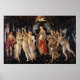 Dieses Gemälde ist im Uffizi Museum ausgestellt. Dieses Gemälde ist voll von Allegorien (verborgene Bedeutungen), was zu einer großen Debatte über die Interpretation des Gemäldes führt. Auf der Wiese können Sie hunderte verschiedener Blume sehen. Die blaue Figur rechts ist Zephyr, der Gott des Westwinds. Zephyr jagt die Nymphchloris, die mit Blume und Frühling assoziiert sind. Zephyrs Atem verwandelt Chloris in eine Frau mit einem Kleid, das mit Blume geschmückt ist (die vermutlich die Göttin des Frühlings ist, Flora genannt). Die zentrale Figur in der Mitte ist die Venus. Zu den links der Venus tanzen die drei Graces. Die Graces sind kleine Gottheiten in der griechischen Mythologie. Zu den links der Gnaden ist Merkur, der Bote der griechischen Götter, der mit seinen Mitarbeitern die Wolken zerstreut. Einige sagen, dass Merkur nach Lorenzo de’ Medici modelliert werden könnte, der dieses Gemälde in Auftrag gegeben hat. Oben auf der Venus richtet Cupid seinen Flammenpfeil auf einen der Graces. Eine ausführlichere Beschreibung dieses Gemäldes finden Sie unter https://www.tripimprover.com/blog/la-primavera-by-sandro-botticelli.