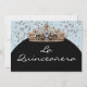 This modern style 5x7 invite is shown created in a light blue and black color scheme with white text, shown with a beautiful blue and gold tiara.