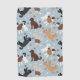 Cute Labradoodle / Goldendoodle dogs sit and stand and rollover with cream, apricot, chocolate, black and party coats with scattered dog bones and pawprints pattern.