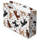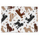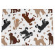 Niedliche Labradoodles in Braun, Schwarz und Bräunen sitzen, stehen und legen mit verstreuten Hundeknochen und Pfotendrucken auf weißem Hintergrund.