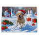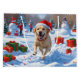 Ein fröhlicher Labrador Hund läuft durch die verschneite Landschaft und trägt einen festlichen roten Weihnachtshut. Die lebendige Winterlandschaft spiegelt die spielerische Energie, Loyalität und herzliche Persönlichkeit der Rasse wider und feiert gleichzeitig den festlichen Geist der Urlaubssaison. Ein herzliches Design mit saisonalem Charme.