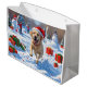 Labrador Hund läuft im Schnee mit Weihnachtshut Große Geschenktüte