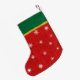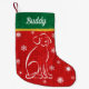 Dieser Labrador-HundweihnachtsStrumpf kennzeichnet einen roten Leinwandhintergrund mit weißen Schneeflocken und ein weißes Cartoonzeichnen eines Labrador-Retrievers. Spitze des Strumpfs ist grüne Leinwand mit einer Goldleinwandgrenze. Personifizieren Sie mit dem Namen Ihr Hundes im Weiß.