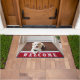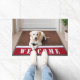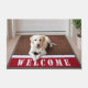Blond Labrador Retriever Hund auf einer roten und braunen Matte mit Begrüßungstext vor der Tür.