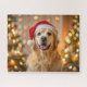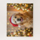 Fluffy golden Retriever mit einer roten Weihnachtsmannmütze. Der Raum mit dem Buch von den bunten Weihnachtsbeleuchtung im Hintergrund.