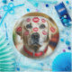 Ein nahes Aufsetzen eines Labrador Retriever Hundes mit rotem Kragen hat mehrere rote Lippenstift-Küsse auf seinem Gesicht, die ihm einen niedlichen Look verleihen