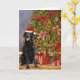 Diese Weihnachtskarte zeigt ein Aquarellbild eines schwarzen Labors mit einer Weihnachtsmannmütze, die unter einem Weihnachtsbaum sitzt.