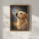 Eine malerische Illustration eines Labrador Retrievers, der einen leuchtend blauen Schmetterling vor einem reichen texturierten Hintergrund betrachtet. Sanfte Beleuchtung, ausdrucksstarke Pinselstriche und tiefe Farben schaffen eine ruhige und träumerische Atmosphäre, inspiriert von künstlerischen Tierporträts.