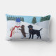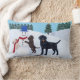Labrador Weihnachten mit Snowman Lumbar Kissen für Labrador Fans. Drei Labrador Hunde spielen mit ihrem Schneemann auf dem weißen Schneefeld. Whimsical Labrador Retriever Gemälde von Naomi Ochiai aus Japan. Der gelbe Labrador und die Schokolade Labrador und der schwarze Labrador sind alle im Bild gemalt.