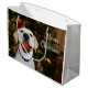 Niedlicher junger gelber Labrador-Retriever hat eine Weihnachtsverzierung, die er ist eine Ballhundeliebhaber große Weihnachtsfeiertagsgeschenktasche denkt