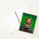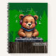 Ein lustiges Notebook mit einem lächelnden, fröhlichen Grizzly Bären DJ mit großen Kopfhörern und Musikangebot auf Turntable. Musik-Dschungeltexte und Noten, die herumschweben.