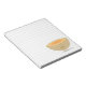 Ein Notizblock mit einem lächelnden kantaloupischen Charakter, über weißes Papier mit grauen Linien.