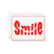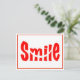 Eine einfache, aber kraftvolle Nachricht auf einer Postkarte. Das Wort "Lächeln" in hellrot mit einer lächelförmigen Lücke, die den Text spaltet.