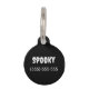 Desteis Cartoon-Abbildung einer niedlich lächelnden Geisterkreatur. Der Geist trägt einen Hexenhut mit lila Details. Die Hintergrundfarbe ist schwarz. Auf der anderen Seite gibt es zwei personalisierbare Textbereiche, in denen einer für den Namen des Tieres ideal ist, während der andere für die Telefonnummer des Besitzers verwendet werden könnte. Dieses Design ist ideal für Halloween Zeit.