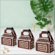 Ein Schokoladenton Gingerbread House Gable Gevor Box mit einem lächelnden Gesicht auf einer Seite. Die Süßigkeiten sind rot-weiße Pfefferminzen. Das Feld muss Bereiche mit anpassbarem Text enthalten.