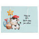 Geschenktasche mit einem bezaubernden Bild mit einer lächelnden Kuh, mit einem goldenen Sternballon und etwas Kuchen und ein Geschenk.