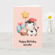 Geburtstagskarte mit einem bezaubernden Bild mit einer lächelnden Kuh, einem goldenen Sternballon und etwas Kuchen und einem Geschenk.