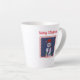 Diese Latte Tasse hat einen lächelnden Schneemann, der einen roten und blauen Hut trägt und einen Schal trägt, der eine helle Weihnachtslippe auf dunkelblauem Hintergrund mit extravagantem, rotem Schnee hält. Passen Sie den frohen Weihnachtstext oben mit der Vorlage an.