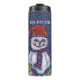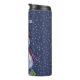 Diese thermische Taumelflasche, um Ihre Getränke kalt oder heiß behalten, ist dunkelblau mit fallenden Schneeflocken und einem lächelnden Schneemann, der einen Winterhut und Schal trägt, der eine leuchtende Saite von hellen Weihnachtslichtern hält. Passen Sie Ihren Text mit Vorlage an.