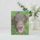 Das Design der Postkarte mit dem Thema Hunde zeigt ein digitales Farbfoto eines lächelnden geretteten Schokoladenlabradors Retriever. Es ist ein einzigartiges Geschenk für Hundefreunde!