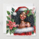 Aquarell-Kunstwerk mit einer schönen Frau mit brauner Haut, die eine Santa-Mütze und ein rotes, Santa-ähnliches Kleid trägt, kombiniert mit dem Text "Frohe Feiertage" (entfernbar/individualisierbar) vor einem Hintergrund mit Poinsettien und Stechpalmen. Sie lächelt warm und blickt den Betrachter an.