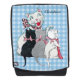 Dieser kühne, erwachsene Rucksack mit einer austauschbaren Vorderseite hat eine lächelnde weiße Mutterkatze, die mit ihren drei Kätzchen in Schwarz, Weiß und Grau sitzt und alle Bögen auf einem karierten, blauen und weißen Hintergrund tragen. Passen Sie Ihren Namen mit der Vorlage an.