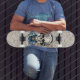 Dieses einzigartige Skateboard verfügt über einen lächelnden Blumenschädel mit Kopfhörer, Set vor einem Vintagen Spitzenhintergrund. Das Design verbindet Boho-, Hippie- und Gothic-Stile und schafft ein auffallendes und edles Aussehen. Ideal für Lieben, die dunkle und blumengeschmückte Elemente mit einer Touch Vintagen Charmes kombinieren.