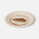 Papier Teller mit einem Erntedank-Design. Ein lächelndes Stück Pecan-Kuchen, umgeben von einem saisonalen Rahmen aus Herbstblättern und dekorativen Zweigen auf einem bräunlichen Hintergrund. Oberhalb des Designs zeigen die Worte "Happy Thanksgiving". Diese Wörter können nach Belieben angepasst werden.