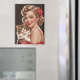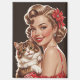Die Abbildung Lächelndes Button-Up mit Cat Portrait zeigt eine fröhliche Frau mit blonden, lockigen Haaren, die mit einem roten Bogen geschmückt ist und ein rotes Blumenkleid mit gepolsterten Details und einer Brosche trägt. Sie hält eine flauschige Tabbierkatze mit orangefarbenem, weißem Fell und grünen Augen. Zu ihren Accessoires zählen zarte Edelsteinohrringe. Der Hintergrund ist schwarz, was die lebendigen Farben ihres Kleides und des Katzenklamotts zu einem fröhlichen, Vintagen Button-up-Pop macht.
