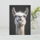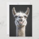 Ein sehr detailliertes nah-up eines lächelnden weißen Lamas mit ausdrucksvollen Augen und einem freundlichen, komischen Ausdruck vor einem dunklen Hintergrund.