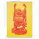 Rotes lachendes Buddha-Holzschnittartbild mit den Händen upraised.