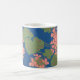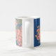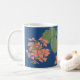 Eine weiße Tasse mit einem durchdachten, bedruckten Design aus lachsrosa Geranien