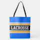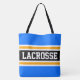 Dieses sportliche Design zeichnet sich durch feinen LACROSSE-Text in einem breiten schwarzen, horizontalen Rennstreifen im Zentrum aus, der mit schwebenden weißen und goldgelben, orangefarbenen Rennstreifen gegen leuchtend blaue Außenstreifen hervorgehoben wurde. Der Text kann personalisiert sein.