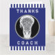 Lacrosse Team Coach Dankeschön-Karte mit laxem Stick auf blauem Hintergrund.