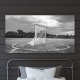 A dramatic black and white canvas print of a lacrosse goal and net on an open field under moody clouds. The monochromatic treatment gives this sports photograph an artistic, timeless feel perfect for a teen bedroom, modern game room, or lacrosse player's hangout space. The panoramic landscape format creates a striking focal point on any wall.