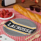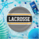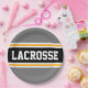 Dieses sportliche, sportliche Design zeichnet sich durch feinen LACROSSE-Text in einem farbig hervorgehobenen breiten schwarzen Streifen mit doppelweißen und gelben Rennstreifen gegen graue hintere Streifen aus. Der Text in diesem Design kann personalisiert sein.
