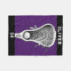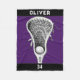 Lacrosse-Spieler oder Coach-Decke mit Knüppel-und-Ball-Design auf lila Hintergrund. So personalisieren Sie Text bearbeiten, um den Namen und die Teamnummer des laxen Spielers hinzuzufügen.